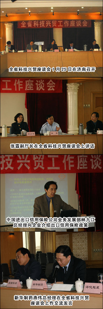 1月25日,在济南召开了全省外经贸系统科技兴贸工作座谈会,来自全省17个市外经贸系统主管业务负责人和部分科技兴贸重点企业代表参加了会议,中国进出口信用保险公司派员参加了会议。会议主要内容是贯彻落实张高丽书记在全省对外开放工作会议上提出的“调整优化出口产品结构,提高机电和高新技术产品出口比重”的指示,对加快实施“科技兴贸”战略,认识上再深化、再提高,工作上再发动,再鼓劲,抢抓机遇,开拓创新,推动外经贸的跨越式发展。科技处通报了科技兴贸战略实施以来特别是去年的工作,分析了当前面临的形势,提出了2005年科技兴贸工作的总体思路和工作措施。中国进出口信用保险公司业务发展部的负责同志讲解了出口信用保险的有关政策及操作程序。各市外经贸局及企业代表作了交流发言。