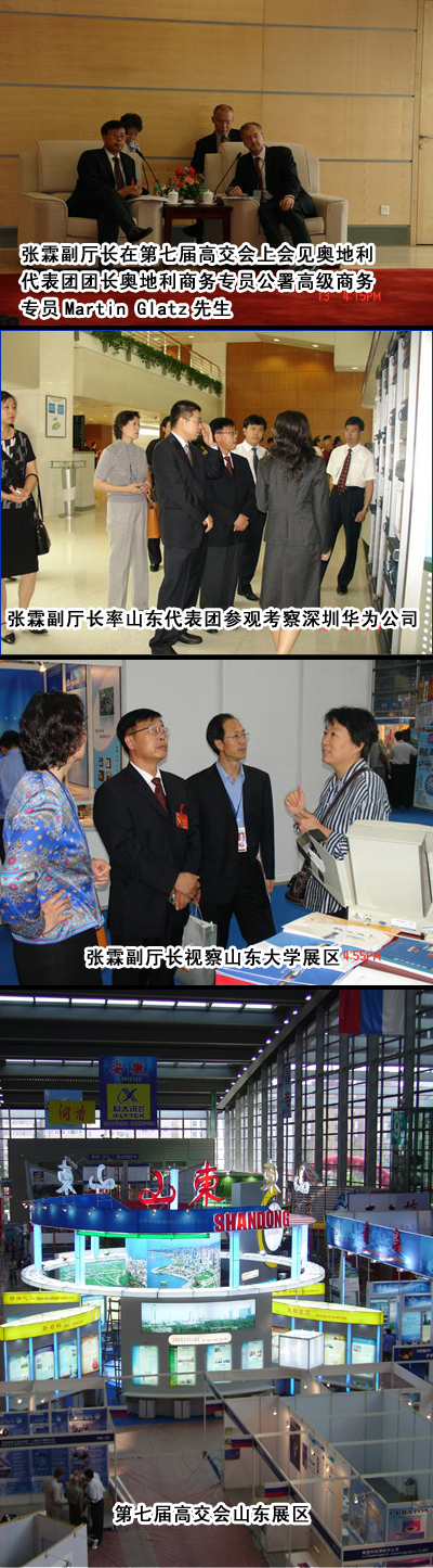 第七届高交会于10月12日在深圳开幕。中央政治局委员、国务院副总理曾培炎、全国政协副主席李贵鲜出席了开幕式。 深圳高交会在社会各界和海内外朋友的鼎力支持和积极参与下,已经成功举办了六届,逐步成为中国规模最大、在国际上颇具影响力的国家级、国际性、高科技展会。第七届高交会更加突出“自主创新”的主题。在坚持国际化有新突破、精品化有新内容、专业化有新举措、市场化有新探索的原则指导下,进一步打造国际经济基础合作的平台。据通报,来自23个国家和国际组织组团参加了本届高交会,参展的国外企业是历届高交会最多的一次,刷新了高交会历史纪录。 截至目前,第七届高交会山东代表团的各项工作进展顺利。本届高交会山东代表团组织了37家企业的45个高新技术项目参会。山东展区以特色鲜明、主题突出、参展项目质量高的特点吸引了络绎不绝的中外参观者。大量的中外客商访问我省各企业展位,与我省参展商进行项目交流和洽谈。据初步统计,高交会前四天,我省参展企业和各市代表共接待中外专业客商600多人次。来自美国、俄罗斯、英国、加拿大、奥地利、德国等国家和香港、台湾地区的专业客商积极与我省企业洽谈和交流。有的项目已经初步达成了合作意向和协议。淄博宇峰实业有限公司与俄罗斯客商达成了产品联合开发意向,会后将进行实质性谈判。淄博科创医疗仪器有限公司分别与奥地利达成激光癌症治疗仪的销售意向、并拟与科创公司合作生产该仪器;还与奥地利达成了共同研制开发电力测试系统仪器的协议。淄博三泵科森公司与奥地利成达了互为销售代理的协议。济南大学带来的Sic 梯度分布的Sic/cf/c复合材料,高性能铜基电接触复合材料和氟涂料三个项目分别与深圳的三家公司达成了四项技术贸易意向。山东同大海岛新材料有限公司与深圳市签订的超细纤维合成革系列产品项目协议,总投资达2000万美元。会前确定的我省15家参展企业的15个对口洽谈项目分别进行了对口洽谈,项目需求方均表示出了浓厚的合作兴趣。分别约定了进行进一步交流洽谈的时间和地点。另外,我省参展商还主动出击于其他海内外展商进行接洽和交流,部分企业选择了一批感兴趣的项目进行了充分的交流,力争在逆向合作上取得成果。各市利用高交会平台积极进行招商引资活动,潍坊市代表团通过招商推介使非参展项目高密图腾酒业有限公司与深圳签订合作协议,引进资金1200万美元,建立葡萄酒生产厂。同时吸引了广州华新科技有限公司和香港联合在潍坊高新区投资生产热塑弹性体新型材料。 在做好现场项目洽谈的基础上,山东代表团还组织参展企业和各市参会代表参加了大会举办的有关论坛、技术交流活动。10月12日代表团组织参展企业和各市代表参观考察了深圳华为公司,参加了奥地利高新技术及创新中小企业推介会。10月13日组织了与奥地利代表团的会晤活动。山东代表团团长张霖同志与澳方代表团团长奥地利商务专员公署高级商务专员Martin Glatz先生进行了会谈,向奥方介绍了我省高新技术发展状况、推介了我省参展企业的项目,表示了加强与奥地利技术和贸易合作的意向。双方中介组织和企业家进行了现场交流,进一步增进了双方的了解。科创公司与奥地利公司两个项目和三泵科森的项目协议就是在充分了解的基础上谈成的。这些活动不仅丰富了我省代表团的活动内容,使参展企业开阔了眼界,而且对高交会项目的洽谈成交起到了积极的推动作用。参展企业代表对我省代表团安排的此类活动给予了较高评价。 二〇〇五年十月十六日