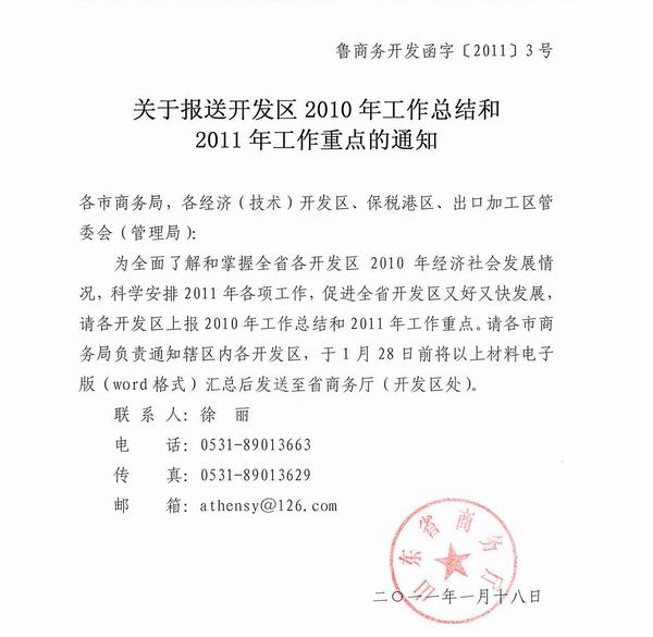 关于报送开发区2010年工作总结和2011年工作重点的通知