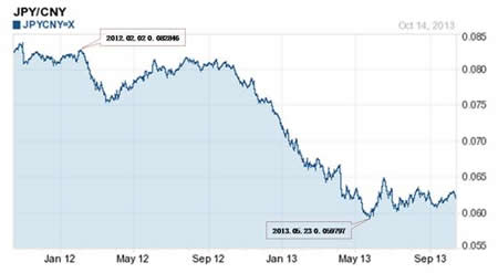 图一:2012-2013年日元对人民币汇率走势 来源:雅虎