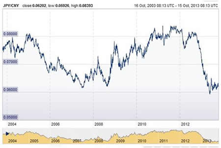 根据中国外汇交易中心数据显示,自2013年开始,日元汇率就直线下降,至5月23日,日元对人民币汇率更是降至十年来最低点0.059797,较2012年2月的最高值0.082846下降了27.82%,之后到10月期间,日元汇率有所提升,但是仍旧徘徊在0.060-0.065之间(见图一)。