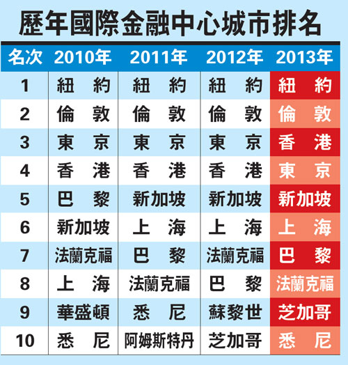 “2013新华─道琼斯国际金融中心发展指数(IFCD Index)”昨日在上海发布。数据显示,2013年综合竞争力排在前十位的国际金融中心分别是:纽约、伦敦、香港、东京、新加坡、上海、巴黎、法兰克福、芝加哥和悉尼。