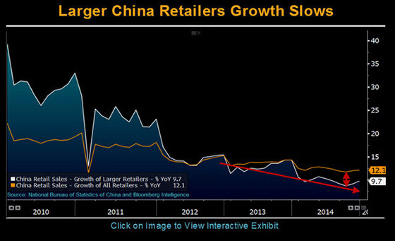 图中白色曲线代表中国大型零售商销售额增速,黄色曲线则代表中国零售商整体销售额增速。如图所示,2010年以前,中国大型零售商销售额增速几乎是整体销售额增速的两倍,然而在2012年中期,整体零售销售增速反超,并在2014年逐步将差距扩大。