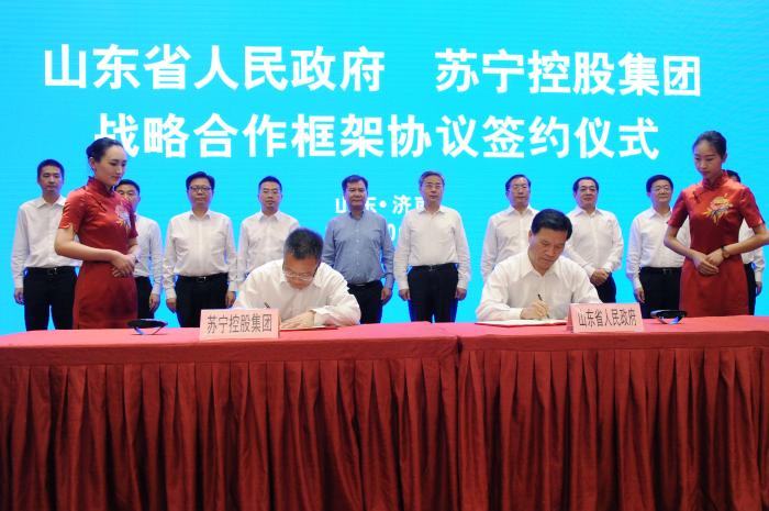 6月24日,山东省人民政府与苏宁控股集团战略合作框架协议签字仪式在济南举行。省委副书记、省长郭树清与苏宁控股集团董事长张近东出席签字仪式,副省长夏耕、苏宁云商集团副董事长孙为民代表双方签署合作协议。协议约定,双方将在置业投资、“互联网+金融”、跨境电商、农村电商、“互联网+扶贫”、智能物流、人才培养等领域深化和拓展合作。