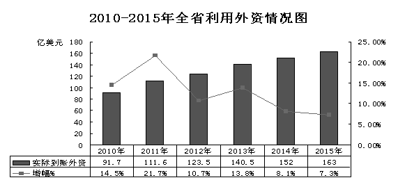 4.利用外资实现稳定增长。“十二五”期间,累计利用外资691亿美元,年均增长12.1%。实际到账外资连年创历史新高,实现了百亿美元量级上的稳定增长,2015年突破了160亿美元。利用外资结构优化,一、二、三产业实际到账外资比重由“十一五”末的3:74:23调整为3:58:39。服务业实际到账外资增长1.5倍,占全省比重由23%提升到39%。现代服务业吸收外资实现新突破,外资融资租赁企业由7家发展到了134家,新增9家外资投资性公司、4家股权投资企业。引进重大外资项目明显增多,新批准总投资过亿美元项目265个,增长1.9倍,韩国现代汽车等7家独立法人研发中心落户山东。吸引世界500强投资取得新进展,新增44家,累计达到203家,在我省投资设立企业642家,惠普(HP)、甲骨文(Oracle)、国际通用机器(IBM)等行业巨头相继落户。企业增资和外资并购成为新的增长点,增资合同外资405亿美元,占全省合同外资总量近一半。新批外资并购企业增加117家,合同外资增长1.3倍。