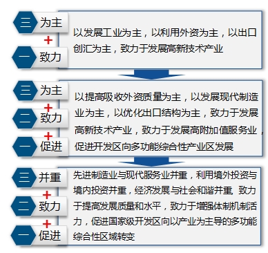 以国家级经开区为例,经开区自成立以来,不断适应国家大的战略方针调整,先后形成“三为主、一致力”、“三为主、二致力、一促进”和“三并重、二致力、一促进”的发展方针,为其吸引外资、引进技术、改革体制、产业结构升级与城市功能升级等明确了方向。
