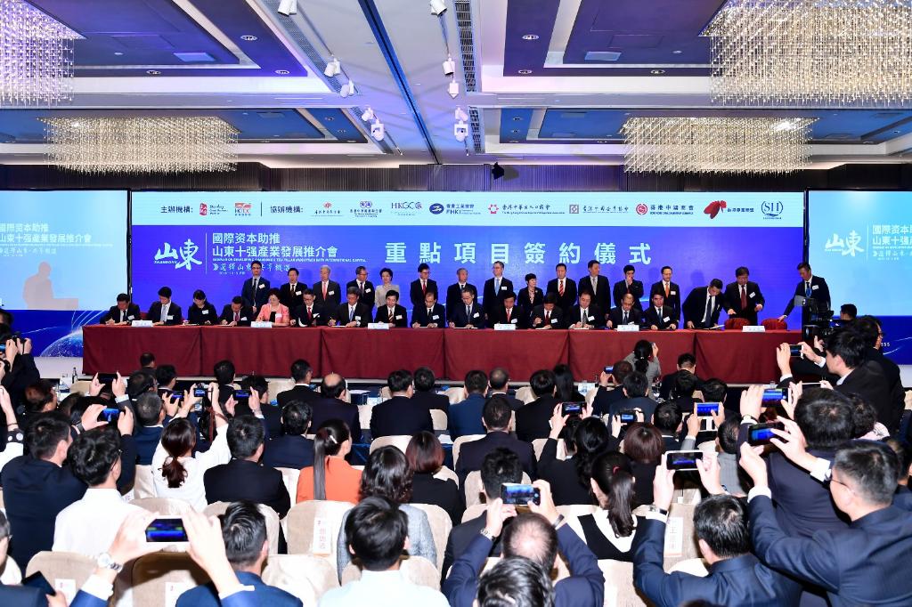 12月5日上午,2018香港山东周国际资本助推山东十强产业发展推介会在香港举行。600余名山东和香港各界人士相聚美丽的香江之畔,同叙鲁港深情,共享山东机遇,谱写鲁港合作新篇章。会上,签约了36个一年内可启动落地的重点合同项目,总投资额达312.5亿美元。