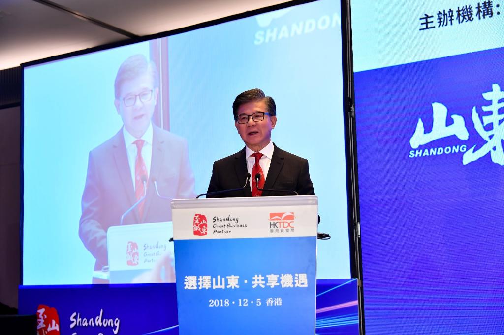 全国政协副主席梁振英出席推介会,省委书记刘家义作主旨演讲,香港贸易发展局主席罗康瑞、香港特区政府政务司司长张建宗致辞。