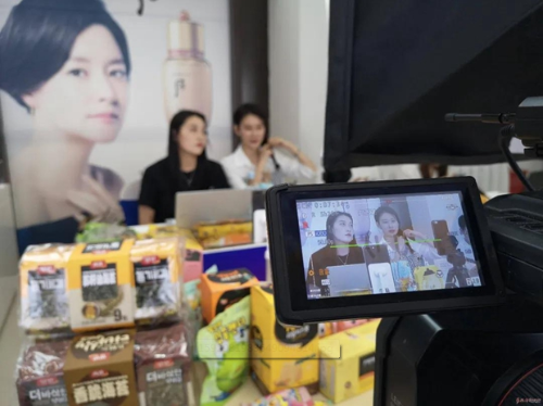 Presenters sell South Korean products during a livestream. [Photo/WeChat account: qdfbwx]