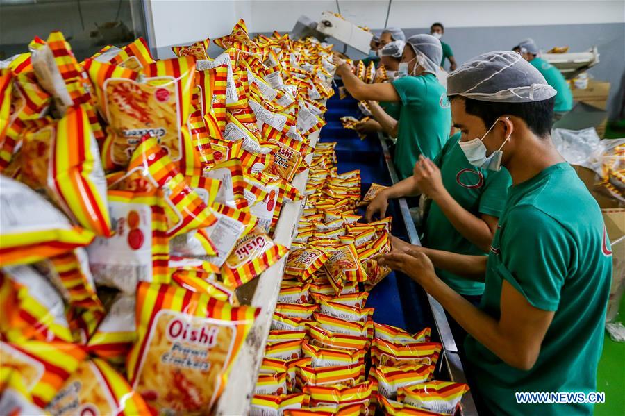 Workers sort packs of products at the Oishi factory in Cavite province, the Philippines on Oct 30, 2020. [Photo/Xinhua]