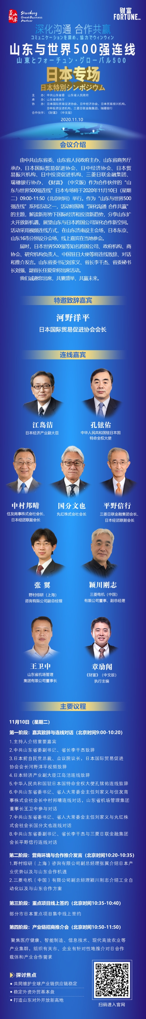 本次活动由日本国际贸易促进协会、日中经济协会、日本贸易振兴机构、日中投资促进机构、三菱日联金融集团、瑞穗银行等机构协助举办,《财富》(中文版) 作为合作伙伴。活动将通过山东与世界500强连线系列活动官网、财富中文网等面向全球直播。