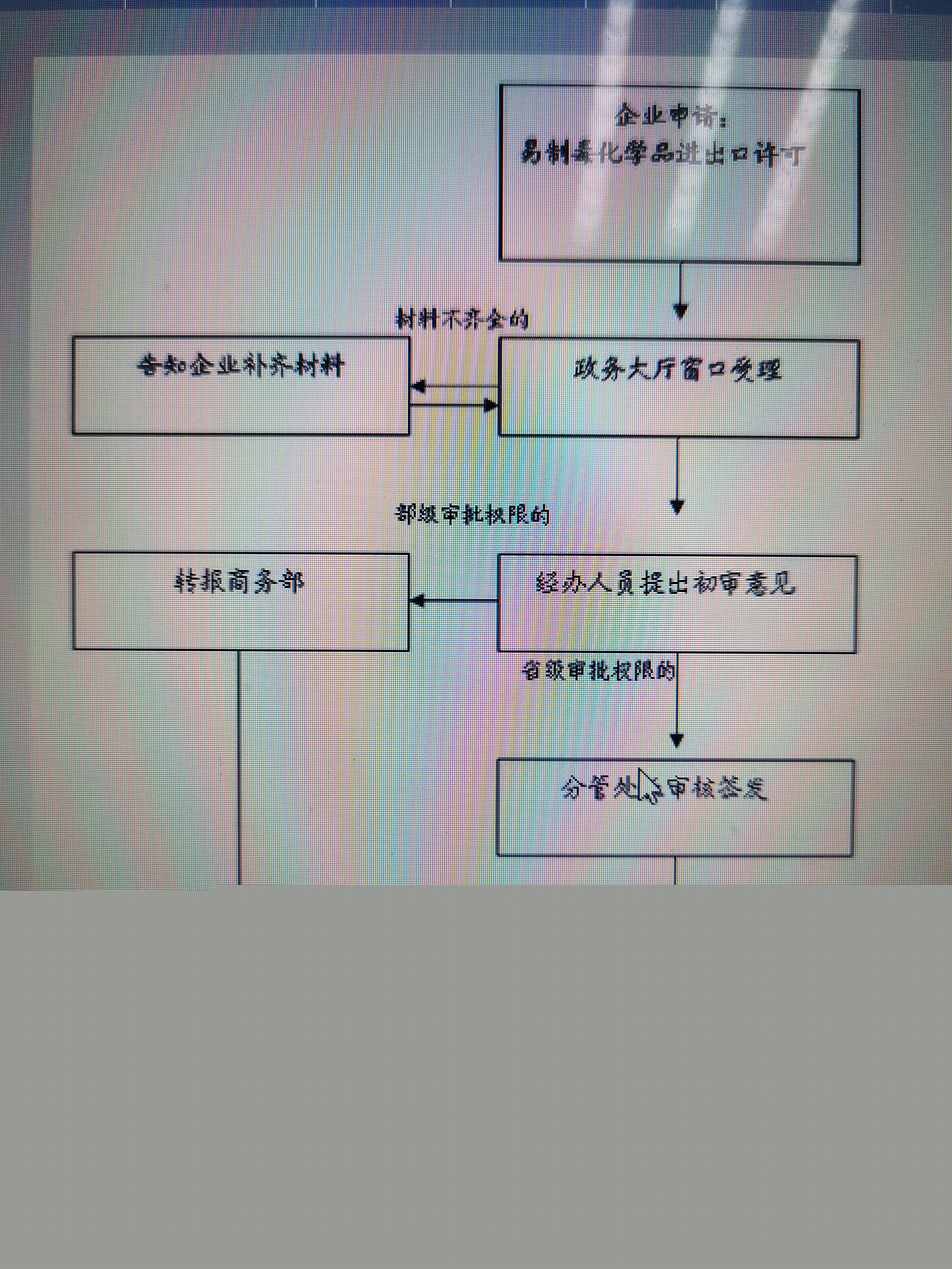 | 受理 | 材料补正 ①属于窗口受理的,受理人当场发现申请材料不齐全或不符合法定形式的,能当场补正的告知申请人当场补正,并予以协助。不能当场补正的,做出补正材料通知单,列明需补正的材料内容、补正期限以及逾期不补正作退件处理的规定。 ②属于信函或网上受理的,受理人发现申请材料不齐全或不符合法定形式的,做出补正材料通知单,列明需补正的材料内容、补正期限以及逾期不补正做退件处理的规定,由窗口人员以电话形式告知申请人。 | 4个工作日 | 网上系统告知转报商务部 |