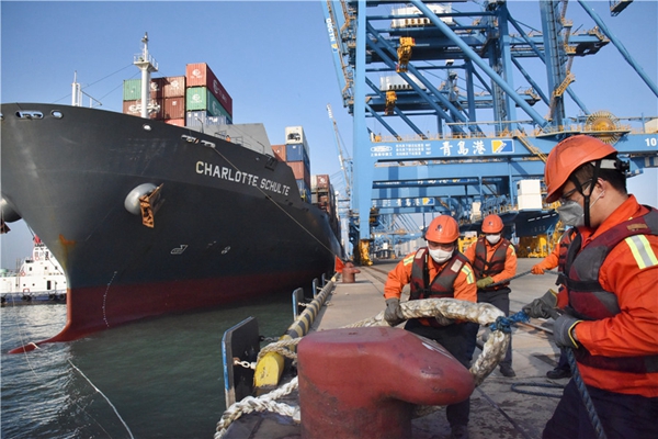 Port employees help a cargo vessel dock at the container terminal of Qingdao Port, Shandong province. [Photo/Xinhua]