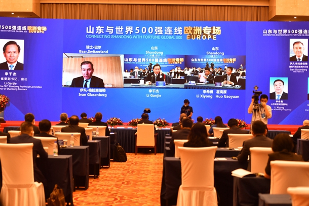 An online serial event, Connecting Shandong with Fortune Global 500 Europe Special, was held on Thursday in Jinan, the provincial capital. [Photo by Zhao Ruixue/chinadaily.com.cn]
