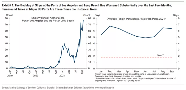 积压的船舶还不仅限于南加州,根据高盛的数据显示,目前装船的船只通过美国主要7个港口所需的时间是历史正常水平的3倍。