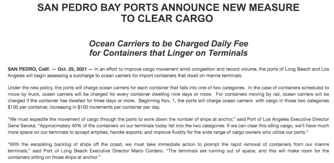 从11月1日起,洛杉矶港和长滩港将针对以下两类货物,向船公司收取100美元/箱的附加费,并且每天增加100美元/箱。