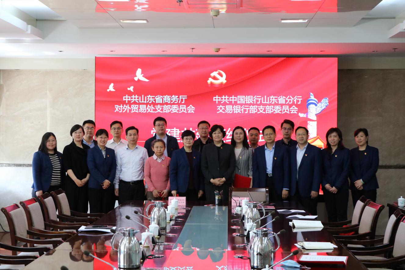 活动中,山东省商务厅对外贸易处党支部书记王红与中国银行山东省分行交易银行部党支部书记王征签署了支部结对共建协议。两个支部全体党员重温了入党誓词,并组织开展了党史专题学习教育座谈交流。在座谈交流中,大家积极发言,介绍了双方单位业务工作基本情况以及党史学习教育的开展情况,交流了各自的工作经验和体会。开展支部共建是两个党支部贯彻落实党史学习教育要求举办的一次活动,是创新党建工作方法的一项重要举措。通过结对共建,既互相学习了双方党史学习教育中好的做法和经验,真正让党史学习教育“活”起来,让学习效果“实”起来,又进一步加深了对两个单位工作性质、工作范围、业务需求的了解,增进了感情,开阔了眼界。