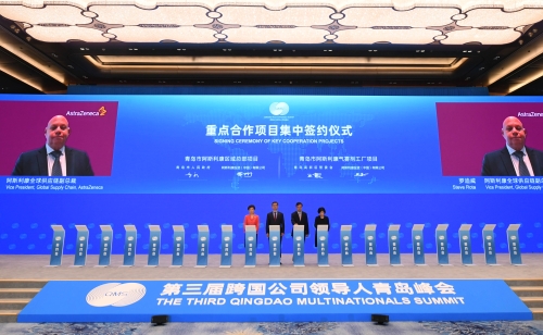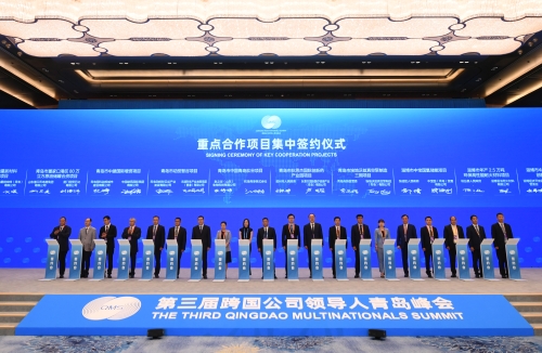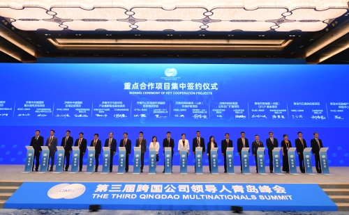 6月20日上午,第三届跨国公司领导人青岛峰会在青岛国际会议中心举行重点合作项目集中签约仪式,99个重点合作项目集中签约。省委书记李干杰出席活动,省委副书记、省长周乃翔致辞,省委副书记、青岛市委书记陆治原出席。
