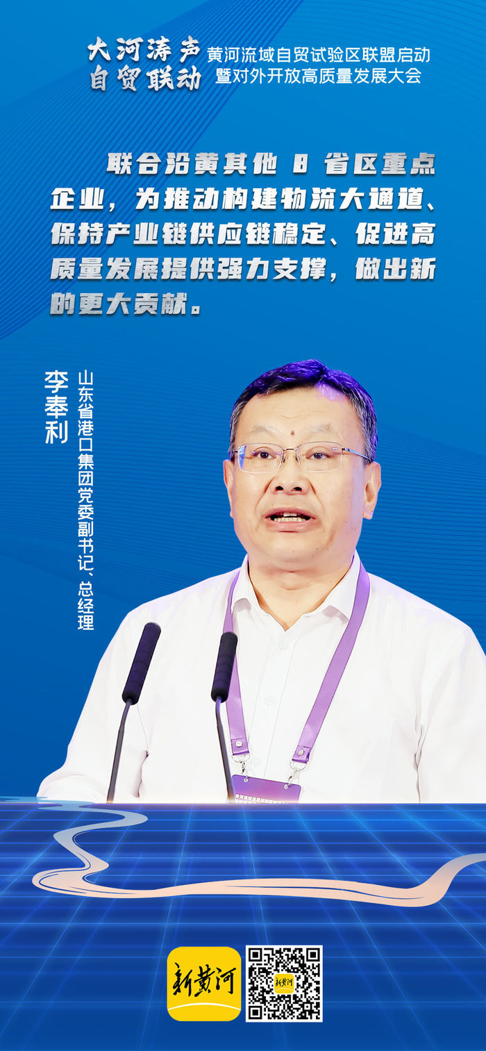 8月23日上午,黄河流域自贸试验区联盟启动暨对外开放高质量发展大会在济南开幕。会上发布了社会信用体系“一体化建设”、行政审批服务“一体化通办”、 知识产权保护“一体化协作”、 物流运输服务“一体化畅通”等联盟四大合作机制。其中,山东省港口集团总经理李奉利发布了物流运输服务“一体化畅通”合作机制。