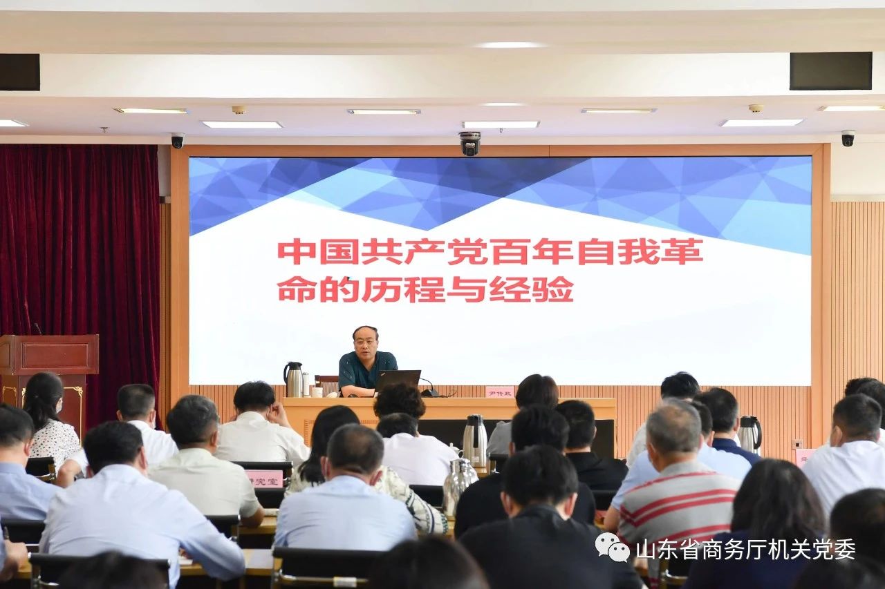 为扎实开展学习贯彻习近平新时代中国特色社会主义思想主题教育,推动全面从严治党向纵深发展,5月17日,省商务厅邀请省委党校尹传政教授作“把党的伟大自我革命进行到底”专题辅导讲座。厅领导,厅机关全体党员干部,驻厅纪检监察组全体党员干部,“双报到”社区——舜中社区党员代表在主会场参加,厅各直属单位党员干部在分会场参加。
