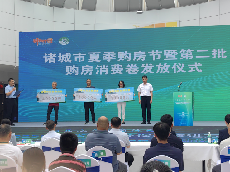 诸城市住建局党组书记/局长王观军同志为购房代表发放第二批购房消费券。