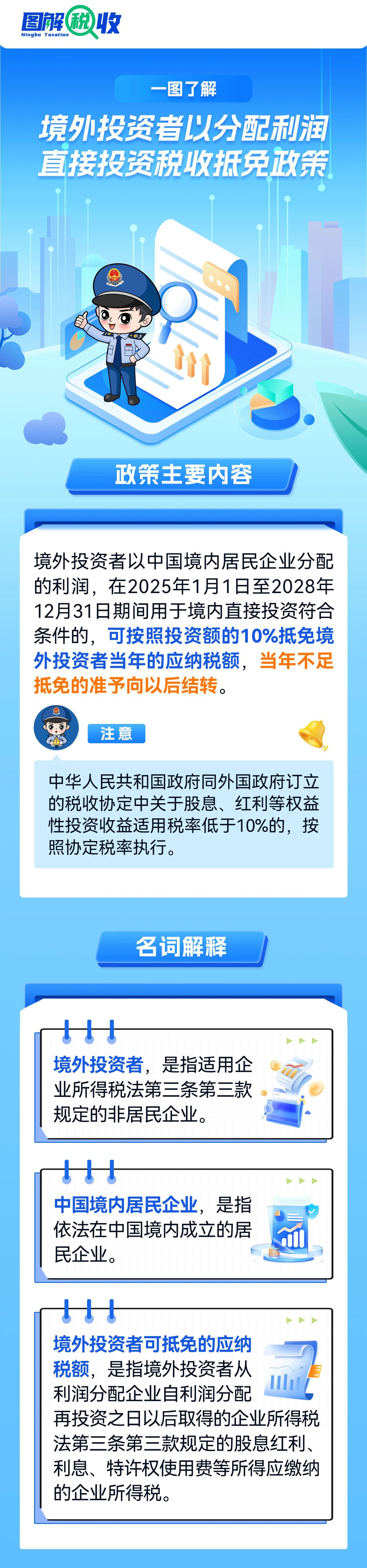 为进一步推进高水平对外开放,持续优化营商环境,促进外资企业在华所获利润更多用于再投资,近日,财政部 税务总局 商务部发布《关于境外投资者以分配利润直接投资税收抵免政策公告》,该政策自2025年1月1日起执行至2028年12月31日,都有哪些重点,一起来看看吧。
