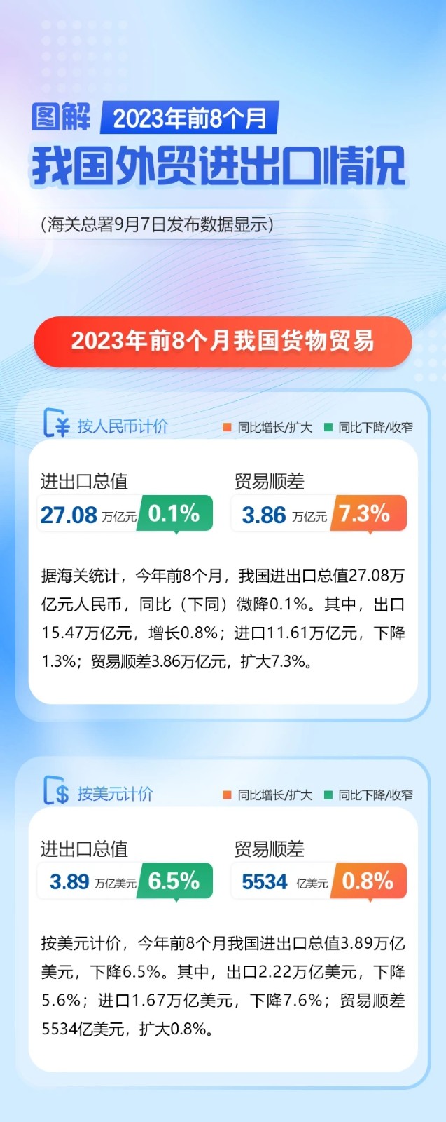 图解 | 前8个月进出口基本持平 8月份进出口环比增3.9%